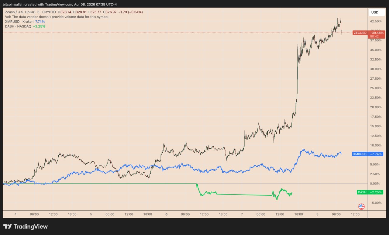 $ZEC оказался в числе самых чувствительных активов. За сутки цена выросла более чем на 30% и достигла около $336. Рост затронул и другие приватные монеты. XMR прибавил около 3%, DASH — около 8%, но их движение выглядело заметно слабее.
