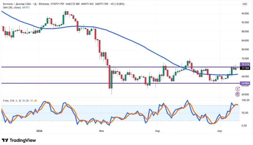 Согласно техническому анализу, биткоин остается в боковике. Несмотря на то, что цена превысила 50-дневную скользящую среднюю (отмечена синим цветом), зона сопротивления между $72 000 и $76 000 все еще не прорвана. Стохастик поднялся в зону перекупленности (выше 80) — медвежий (на продажу) сигнал. Уровень поддержки на дневном графике — $65 000.