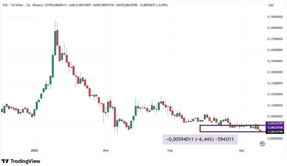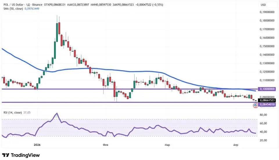 Стоимость криптовалюты Polygon с 3 по 10 апреля снизилась на 6,44%. $POL продолжает торговаться недалеко от своего исторического минимума, показанного в феврале. На прошедшей неделе криптовалюта Polygon демонстрировала отрицательную динамику на протяжении каждой торговой сессии за исключением вторника, 7 апреля, когда монета прибавила 3,31%.