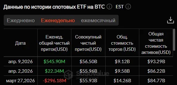Спотовые ETF на биткоин вторую неделю подряд фиксировали приток денежных средств. На этот раз он составил $545,9 млн. Большая часть этой суммы, $474,5 млн, пришлась на фонд компании BlackRock, iShares Bitcoin Trust (IBIT).