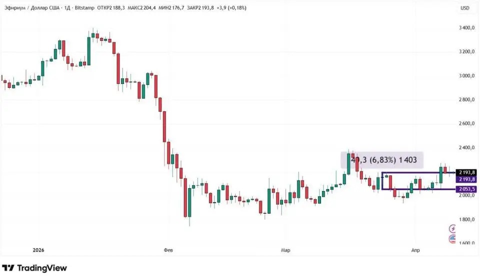 Стоимость эфира с 3 по 10 апреля выросла на 6,83%. Это позволило $ETH обновить максимум последних трех недель. Большая часть роста пришлась на одну торговую сессию во вторник, 7 апреля, когда эфир прибавил сразу 6,32%.