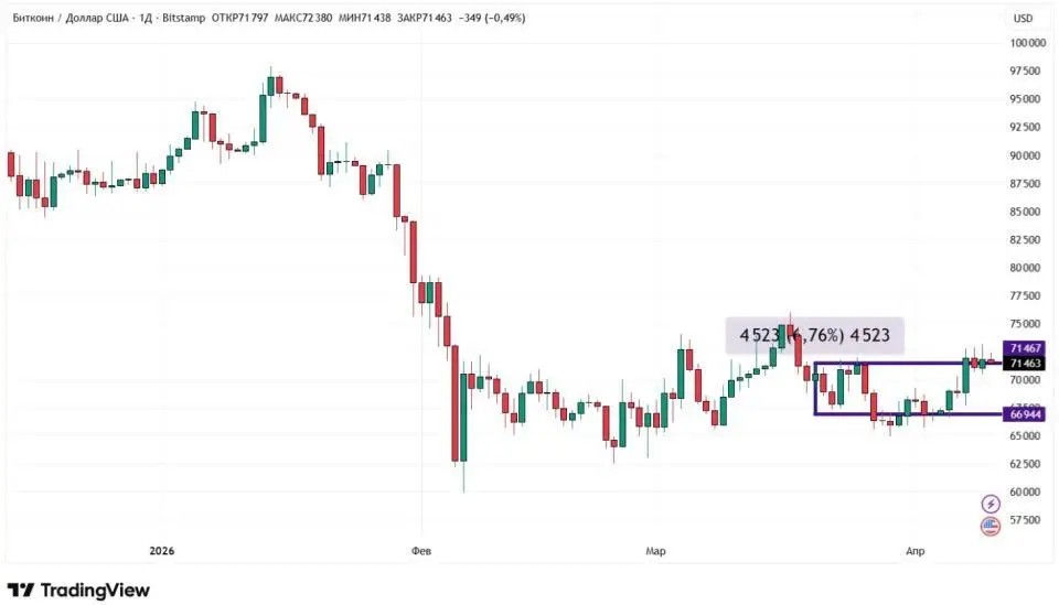 Биткоин с 3 по 10 апреля 2026 года прибавил 6,76%. Крупнейшая по капитализации криптовалюта успешно закрепилась выше важной психологической отметки $70 000. Волатильность $BTC остается низкой: только по итогам одной торговой сессии во вторник, 7 апреля, цена менялась более чем на 3%.