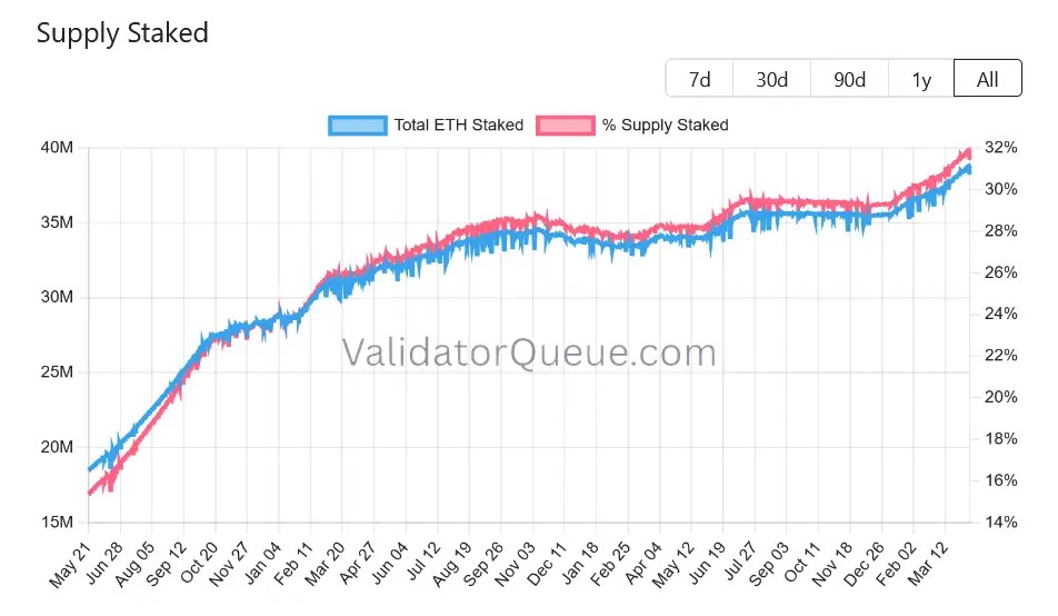 Положительной динамике второй по капитализации криптовалюты способствовала не только международная напряженность, но и рекордные показатели стейкинга. Количество заблокированных таким способом монет на прошедшей недели впервые превысило 38,5 млн. Это не только подтверждает повышенный спрос на эфир со стороны инвесторов, но и уменьшает свободное предложение $ETH. Последнее положительным образом сказывается на цене.