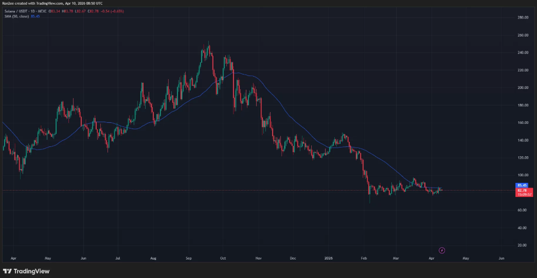 С февраля 2026 года цена Solana колеблется в диапазоне от $76 до $92. За последние две недели криптоактив опустился в нижнюю часть этого диапазона. При этом курс упал ниже 50-дневной простой скользящей средней, после чего с октября 2023 года всегда наступало значительное медвежье давление.