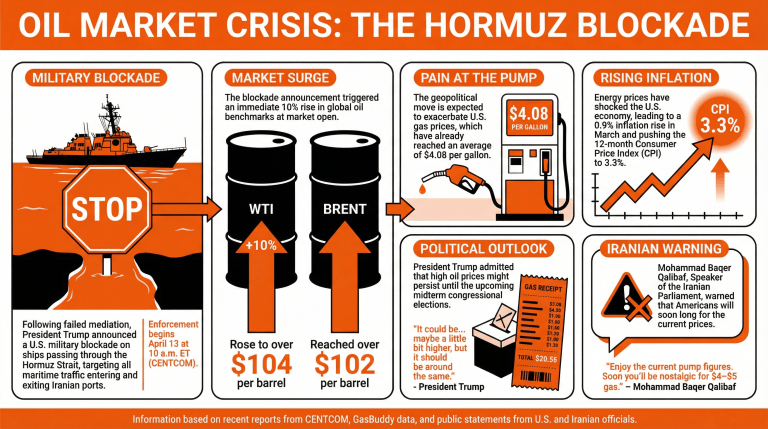 - Блокада Ирана, объявленная Трампом 13 апреля, привела к резкому скачку цен на нефть марки WTI до 104 долларов, что создает угрозу для будущих цен на бензин в США.