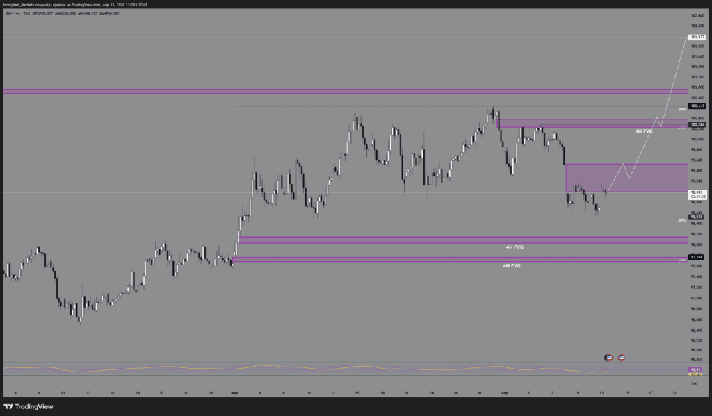 Самый позитивный расклад для крипторынка. DXY дает локальный отскок, тестирует зону сопротивления (верхний 4H FVG в районе 100,200), получает оттуда агрессивный отказ и уходит в глубокую капитуляцию. Пробивается уровень pWL, и цена валится к глобальной поддержке на 97,768.
