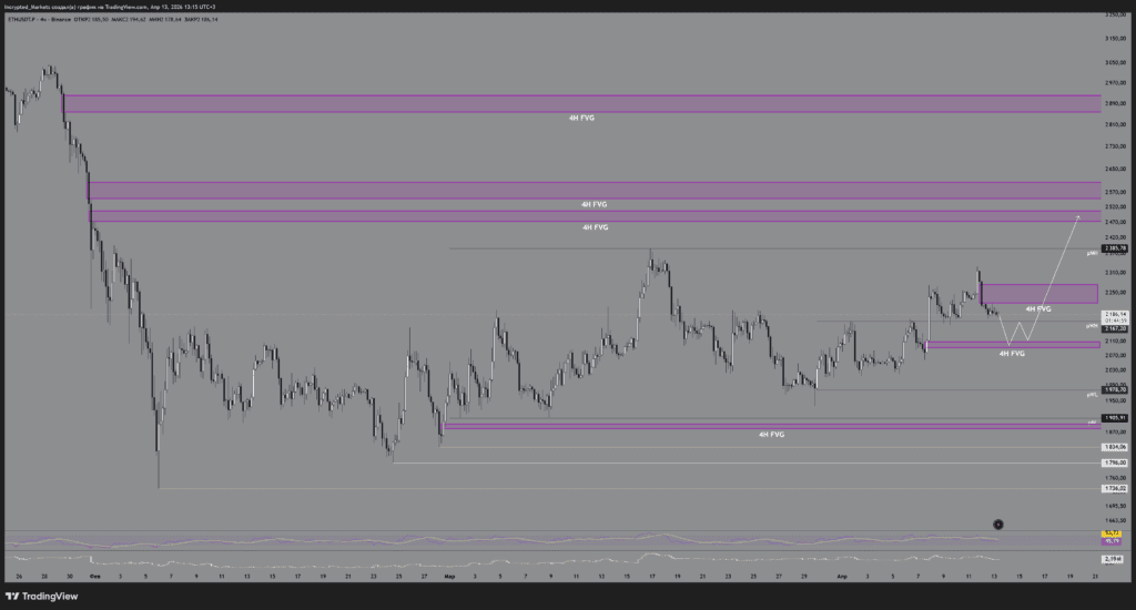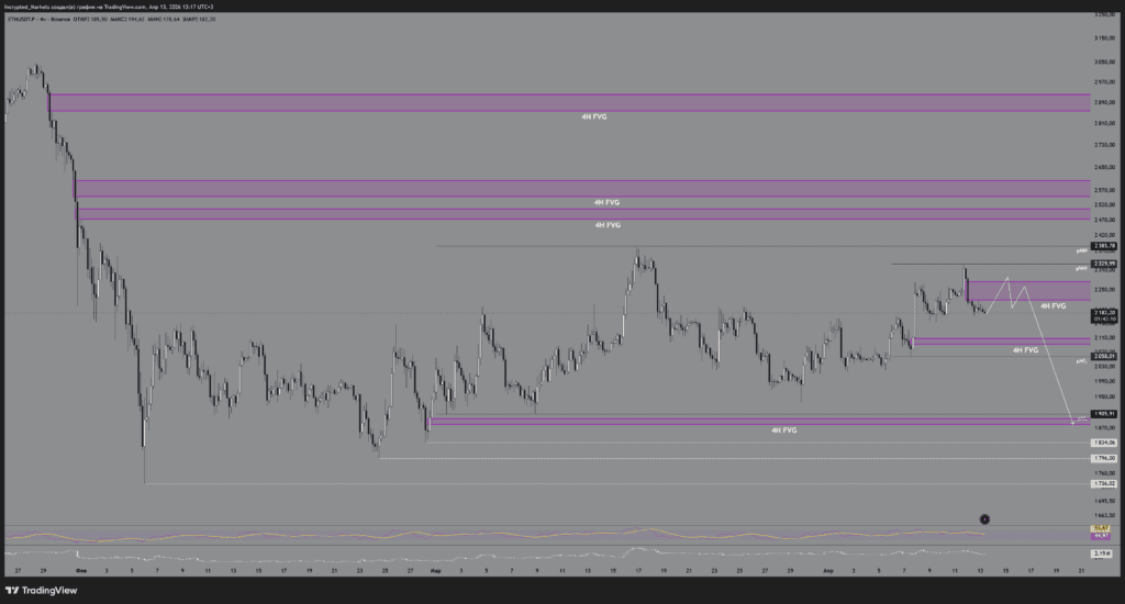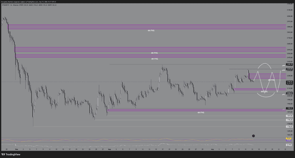 Синхронно с Сценарием С по ВТС, мы можем получить локальный импульс покупок для заполнения верхнего 4Н FVG, после чего последует жесткая коррекция в область $1900 и ниже. Это сценарий отработки тотального, глобального risk-off на рынках.