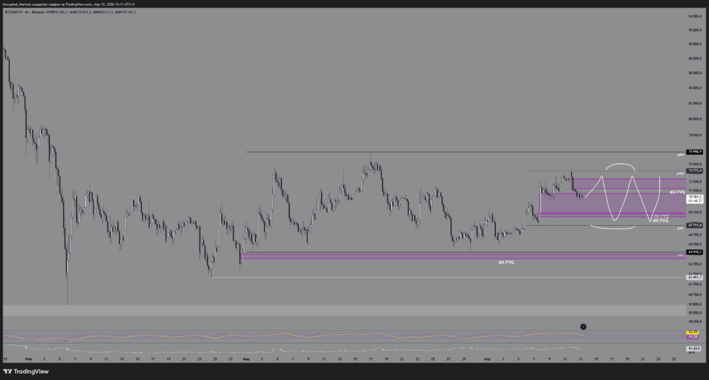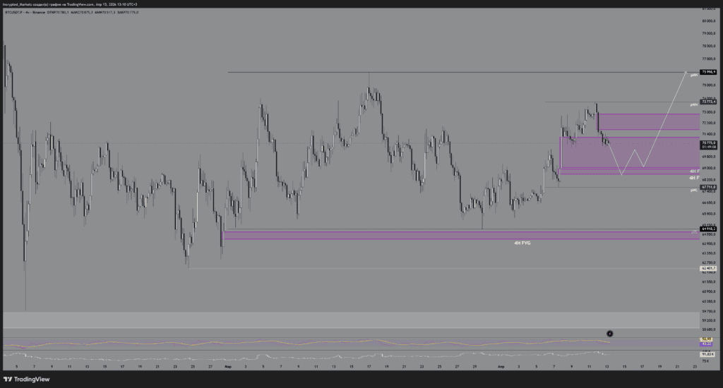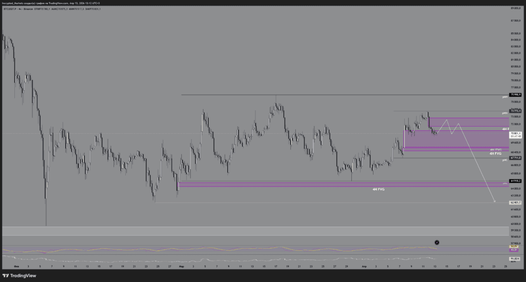 Неспособность цены пробить и закрепиться выше отметки $73 800 наглядно указывает на слабость покупателя и неуверенность в продолжении глобального лонга. Это открывает путь для формирования затяжного ренджа в диапазоне $68 000-$74 000 с ложными выносами (девиациями) по обе стороны ради изматывания толпы и сбора ликвидности.