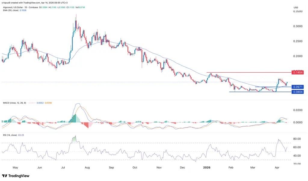 Дневной график показывает, что цена $ALGO сформировала прочный минимум на уровне 0,0805 доллара в начале этого года. Затем она отскочила после объявления о плане сокращения штата на 25% и после упоминания в отчете Google.