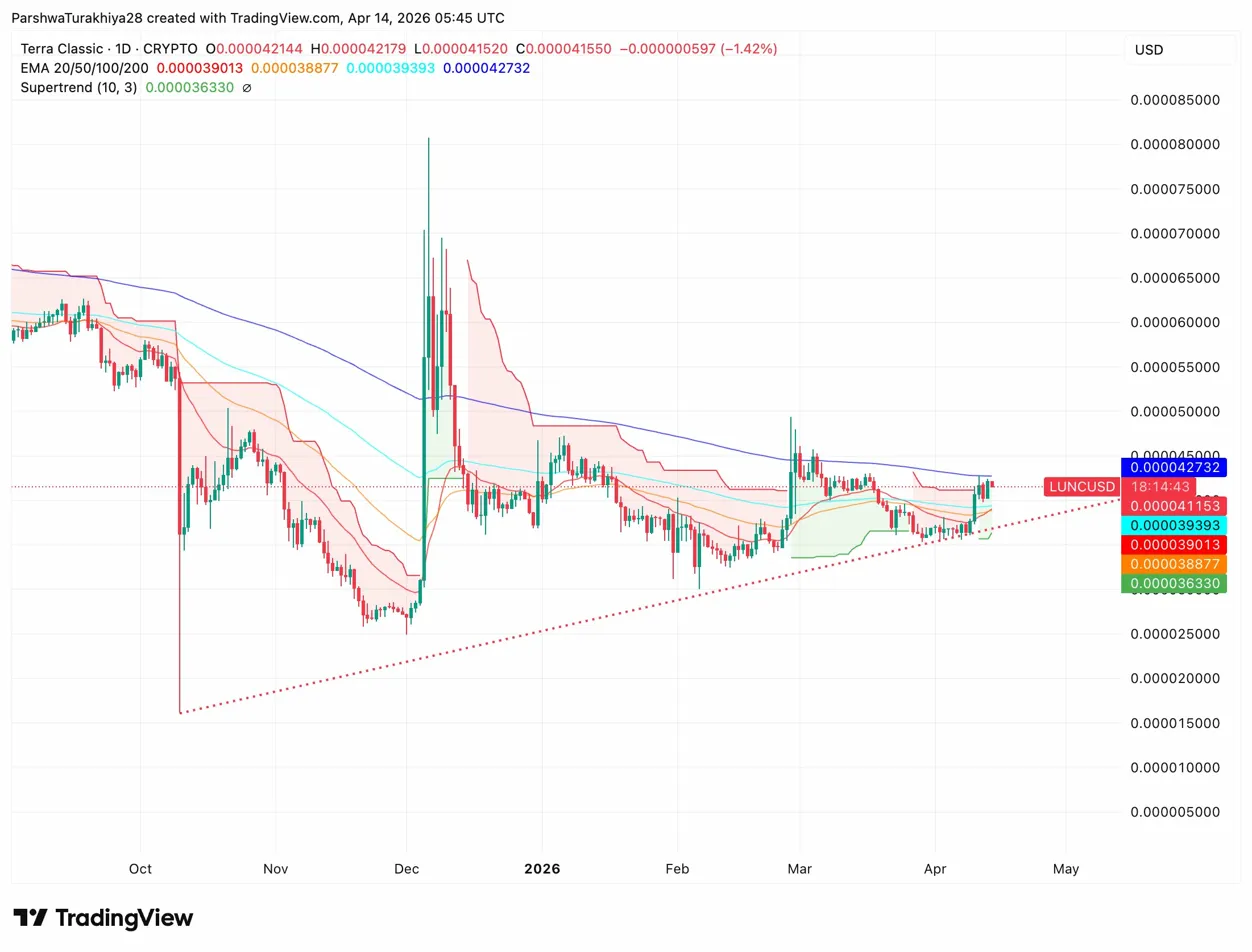 $LUNC торгуется по $0.0000416 14 апреля, снизившись на 1,42%, впервые с октября занимая позиции выше всех четырёх EMA, поскольку Upbit объявляет о приостановке снятия средств с 17 апреля для обновления сети.