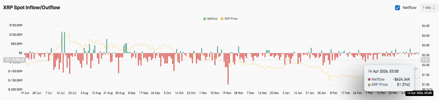 Кроме того, данные по спотовым потокам показывают устойчивые оттоки в последние месяцы, что сигнализирует о продолжающемся давлении на продажи. Однако эти оттоки начали снижаться. Недавние почти нейтральные потоки указывают на ослабление импульса продаж. Важно, что эта стабилизация совпадает с текущей консолидационной консолидацией цен $XRP.