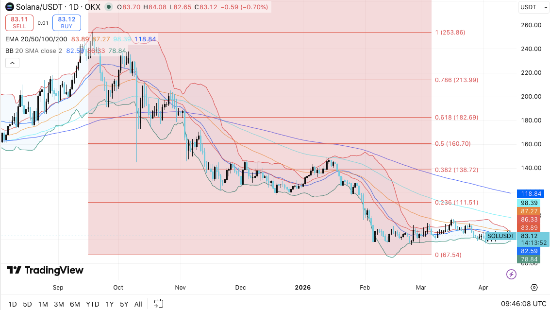 Более широкая техническая структура показывает, что $SOL консолидируется внутри нисходящей структуры. Кроме того, диапазоны Боллинджера продолжают сжиматься, что сигнализирует о предстоящем росте волатильности.