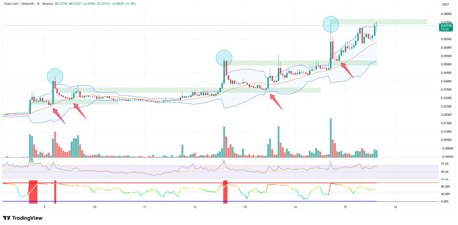 Если $ENJ не удержится выше $0,07332, при этом с учётом перегретого RSI на уровне 93,3, медвежьей дивергенции на часовом таймфрейме и высокой волатильности по BBWP, это может привести к резкому развороту.