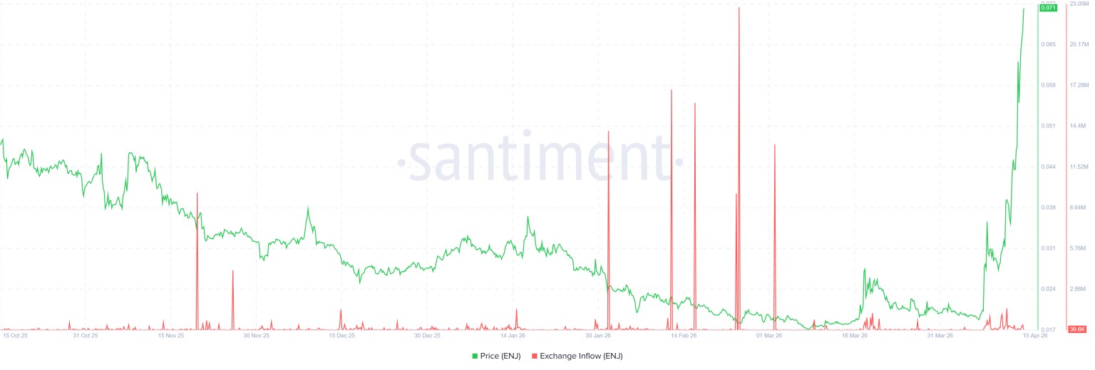 Данные ончейн-аналитики от Santiment, пожалуй, выглядят самым сильным аргументом во всей этой истории. Несмотря на то, что цена $ENJ за последние дни почти удвоилась, приток токенов на биржи остаётся практически нулевым, всего около 19 600 $ENJ на момент написания.