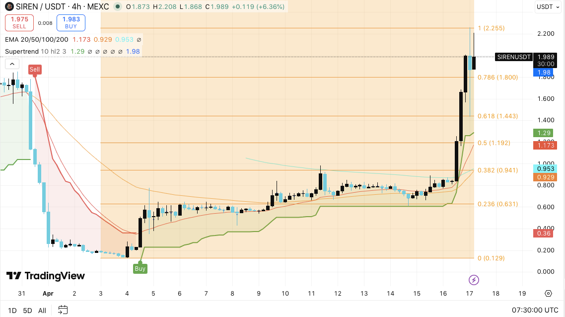Siren ($SIREN) продолжает доминировать в заголовках после взрывного роста, который поднял цену до $1.94. Токен вырос более чем на 130% за 24 часа и почти на 170% на этой неделе. Этот всплеск отражает высокий интерес рынка и сильный спекулятивный спрос.