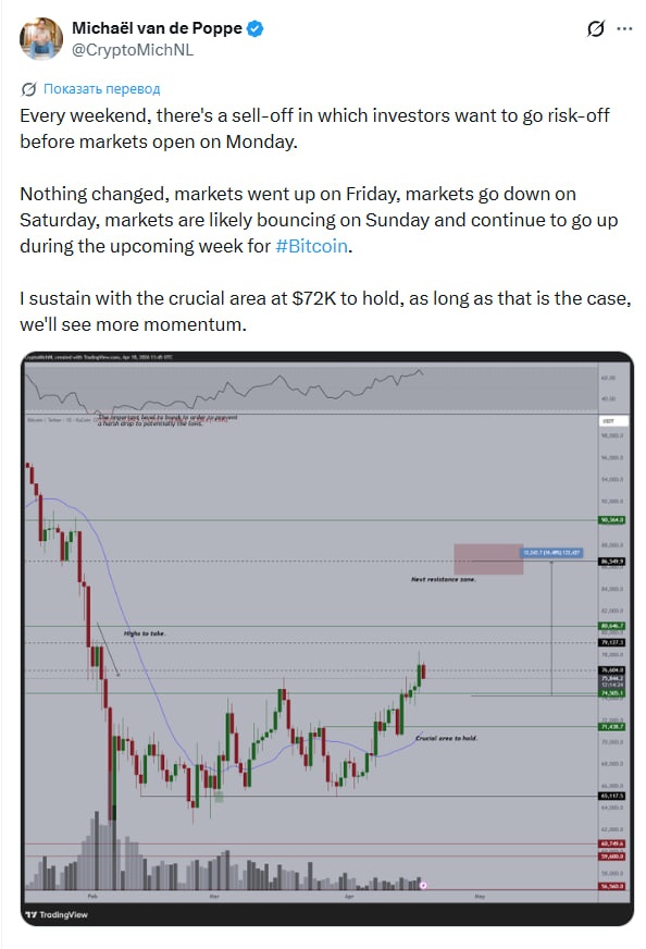 Аналитик также определил уровень в $72,000 как ключевую зону поддержки, удержание выше которой поможет сохранить бычий импульс.