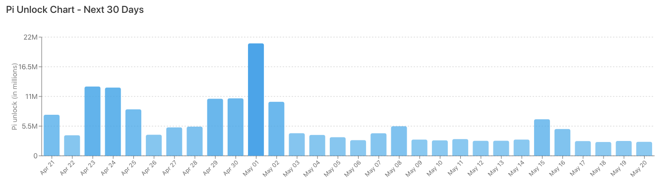 Ежедневные разблокировки в среднем составляют около 5,9 миллиона PI, что добавляет стабильной ликвидности на рынок. Кроме того, ожидается максимальное открытие более 20 миллионов PI 1 мая. Этот скачок может увеличить краткосрочную волатильность.