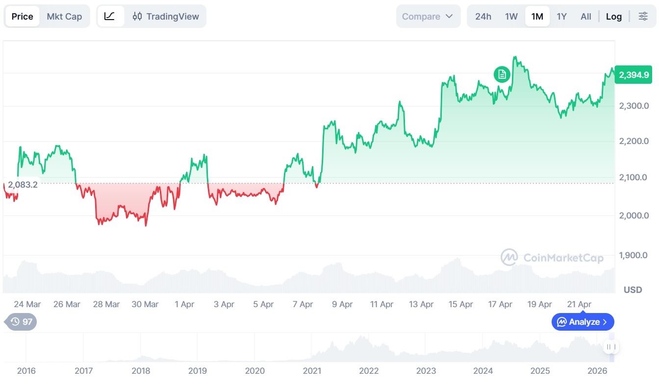 По данным CoinMarketCap, за последний месяц Ethereum прибавил в цене порядка 12%, до ~$2340.