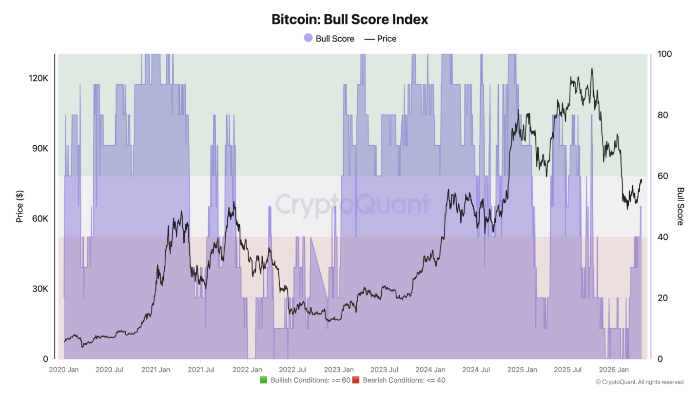 Платформа онлайн-аналитики CryptoQuant фиксирует: Bitcoin Bull Score Index (BSI) достиг шестимесячного максимума. BSI агрегирует девять метрик, связанных с движением цены биткоина, и формирует сводную картину состояния рынка. После того как медвежий цикл набрал обороты, индикатор уверенно держался в отрицательной зоне — точно так же, как в начале предыдущего медвежьего рынка четыре года назад.