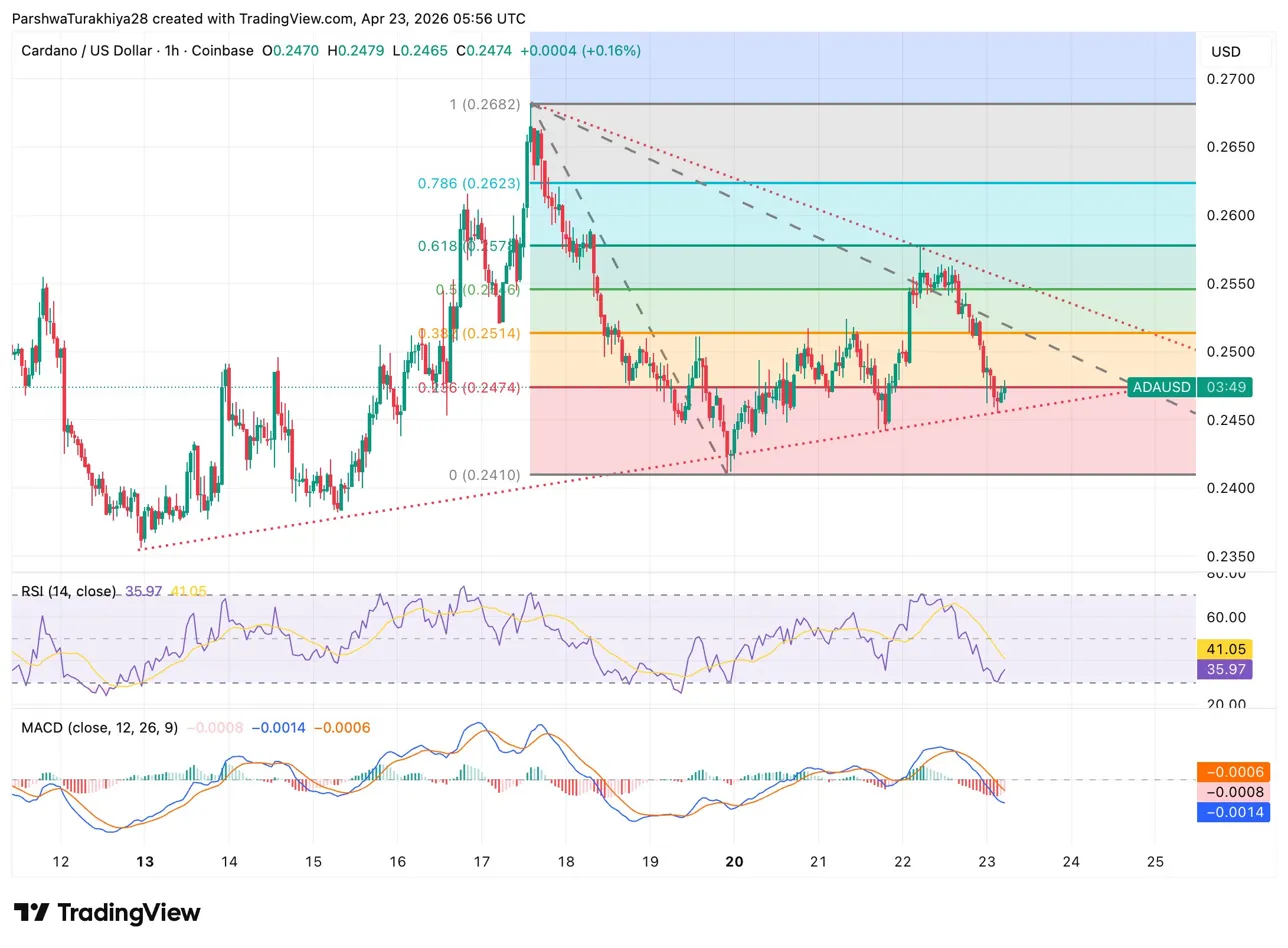 $ADA торгуется на уровне $0,2474 23 апреля, увеличившись на 0,16%, находясь на уровне Фибоначчи 0,236, поскольку Input Output сокращает запрос на общественное финансирование вдвое до $46,8 млн, а физическая дебетовая карта Cardano Visa в тот же день запускается в 130 странах.