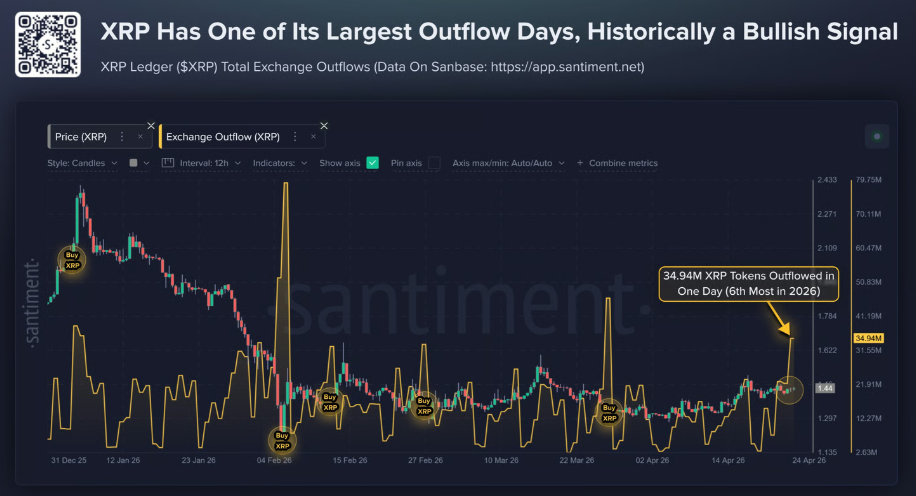 По данным Santiment, за последние сутки трейдеры вывели почти 35 млн $XRP, что стало шестым по величине ежедневным оттоком в этом году.