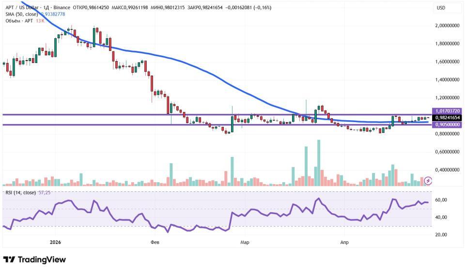 По состоянию на конец апреля индикаторы указывают на формирование бычьего тренда. Цена Aptos превышает 50-дневную скользящую среднюю (отмечена синим), а RSI поднялся выше значения 50. Ближайшими уровнями сопротивления для $APT станут $1,01, $1,08 и $1,12. Уровень поддержки — $0,91.