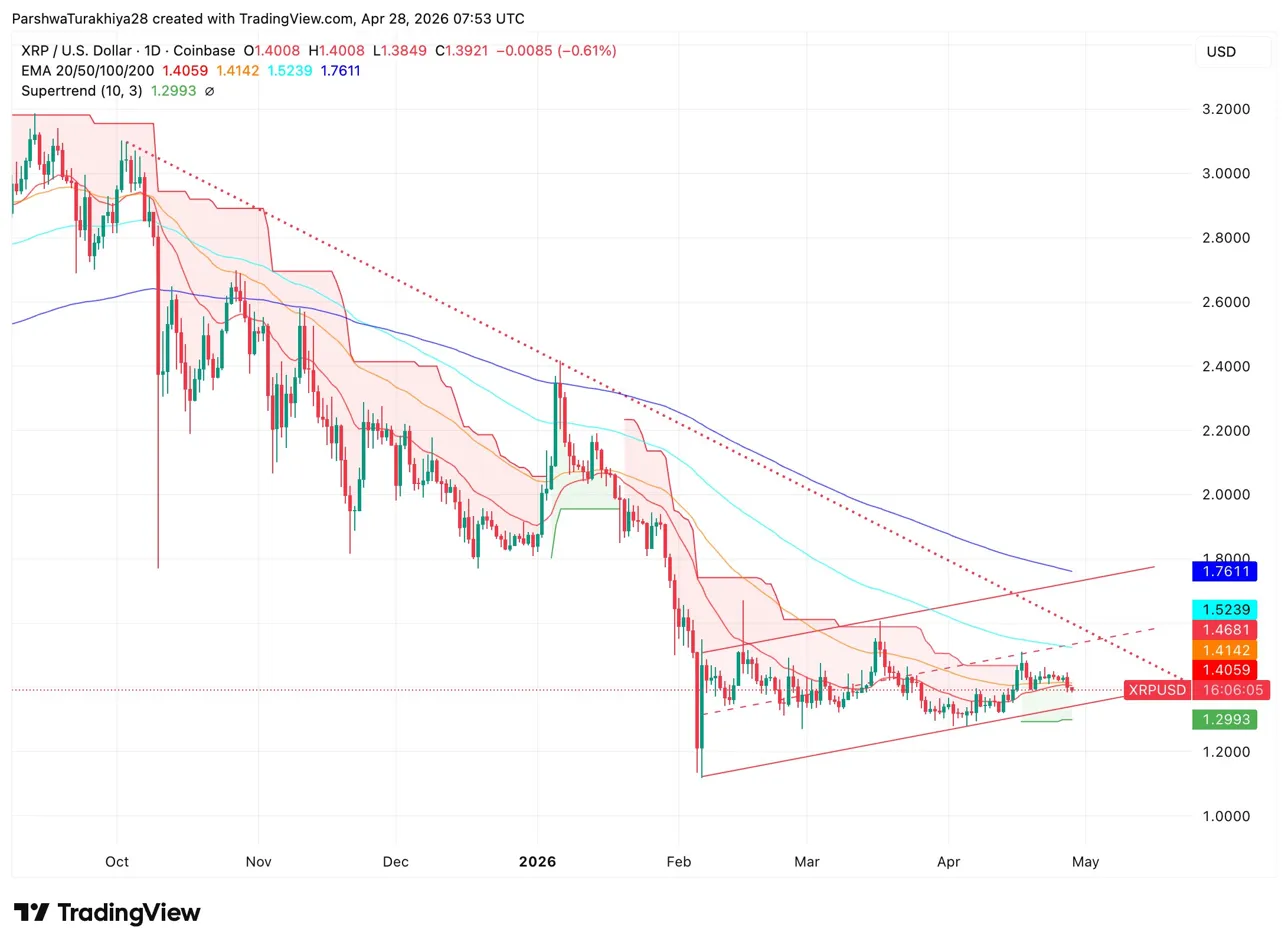 $XRP торгуется на уровне $1.3921 28 апреля, снизившись на 0.61%, опустившись ниже уровня $1.40, который служил поддержкой большую часть апреля, поскольку южнокорейский KBank объявляет о партнёрстве Ripple для трансграничных переводов в блокчейне, и график разрешает многомесячный треугольник вниз.
