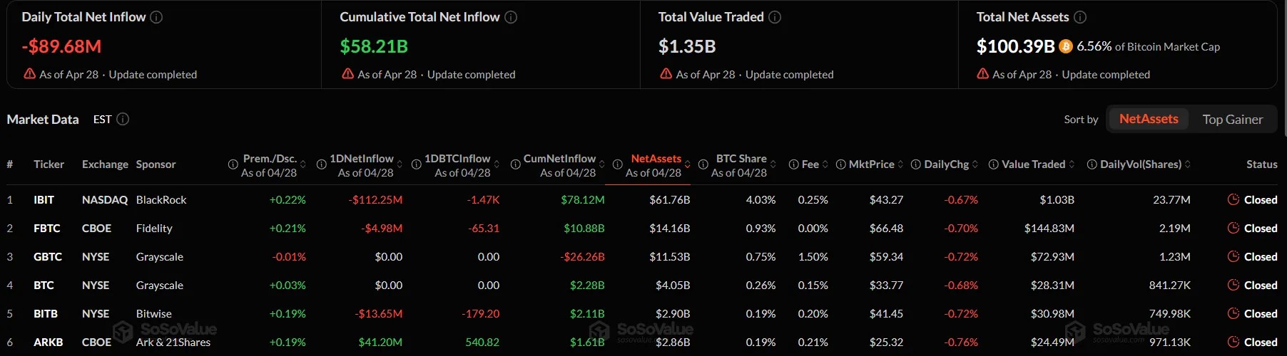 Однако данные SoSoValue за 28 апреля указывают на локальное охлаждение интереса к биржевым фондам. Спотовые биткоин-ETF зафиксировали чистый отток средств в размере $89,68 млн. Лидером антирейтинга стал фонд IBIT от BlackRock— он потерял $112,25 млн.