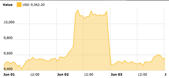 Таким образом топ-менеджер отреагировал на последний всплеск волатильности биткоина, когда цена выросла на 10% до $10 380, а затем внезапно упала до $9500.