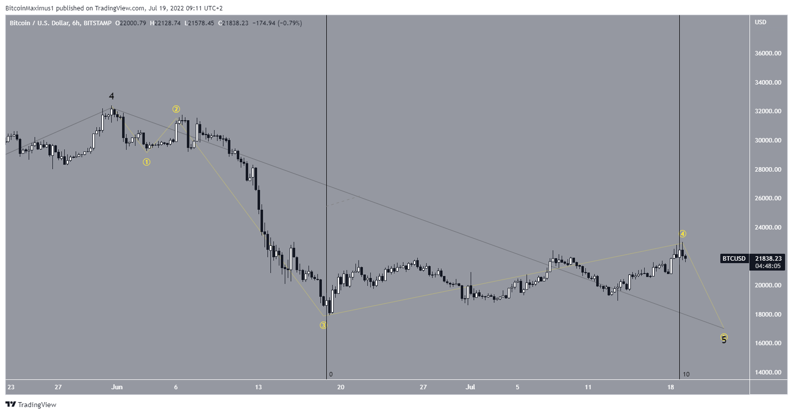 Альтернативный сценарий основывается на неоднозначных (включающих медвежьи) сигналах 6-часового графика. В этом случае BTC завершил волну 4 и может снова снизиться для завершения формирования волны 5. Впрочем, тогда длина волны 4 будет в 10 раз превышать длину волны 2, что крайне нехарактерно для подобных структур.