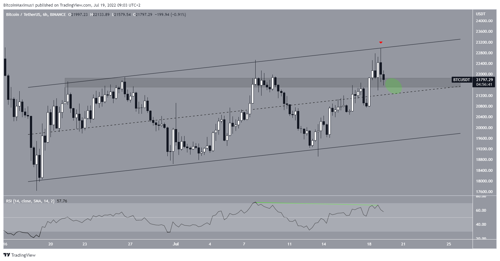 В то же время BTC все еще держится выше срединной линии этого канала, а также над упомянутой ранее горизонтальной областью на $21 700.