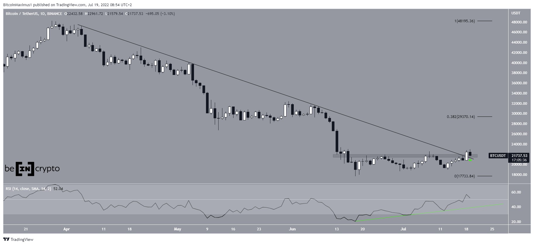 Впрочем. 18 июля цене удалось, наконец, совершить прорыв этой линии. Кроме того, рынок восстановился над областью горизонтального сопротивления $21 700. Сейчас BTC пытается превратить в поддержку оба этих уровня.
