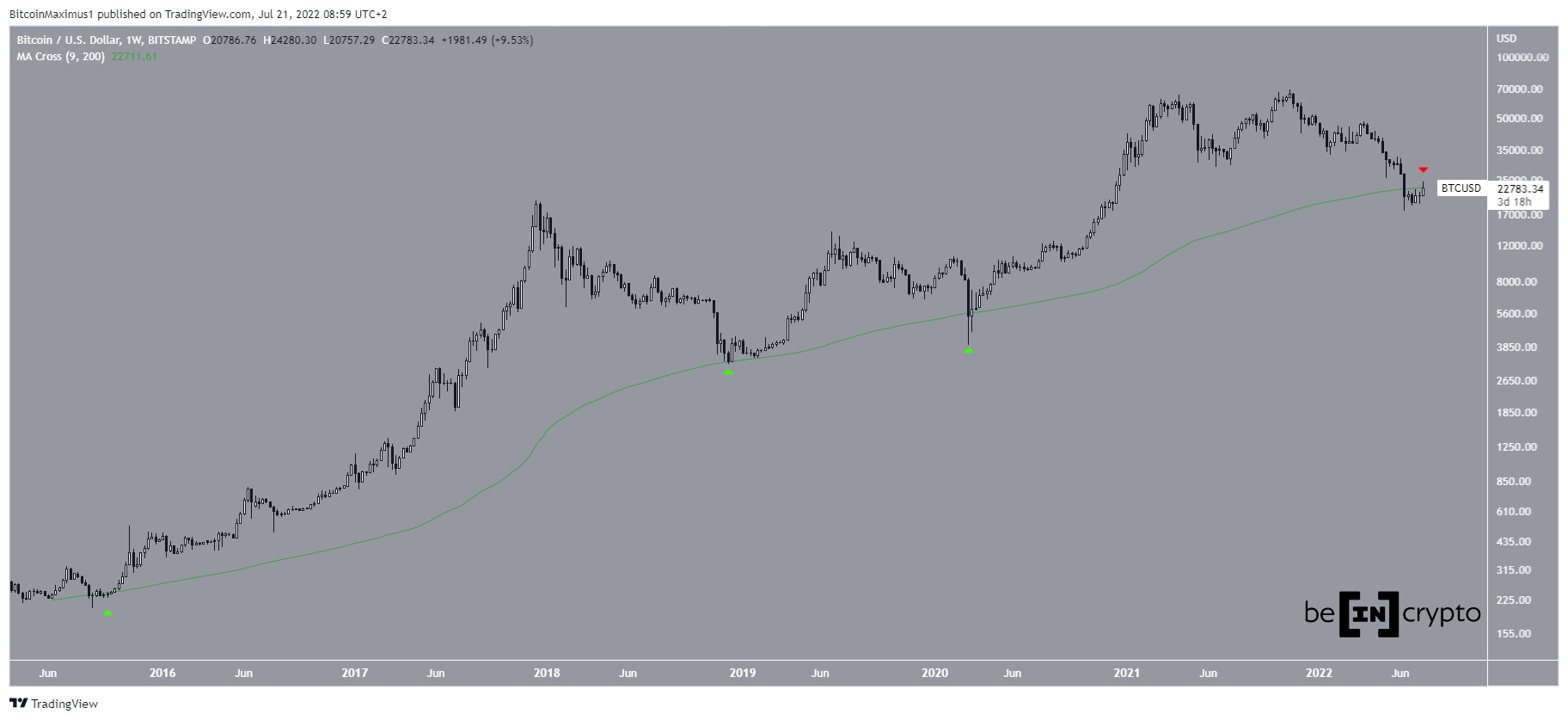 Биткоин (BTC) совершил бычий пробой долгосрочной линии нисходящего сопротивления и теперь пытается восстановиться над 200-недельной скользящей средней (МА).