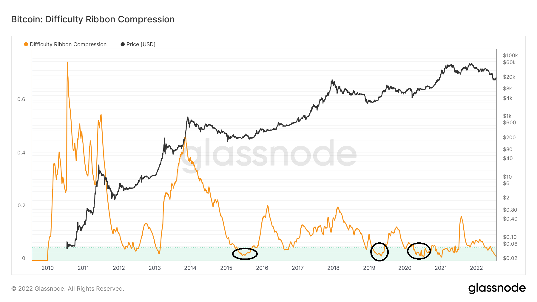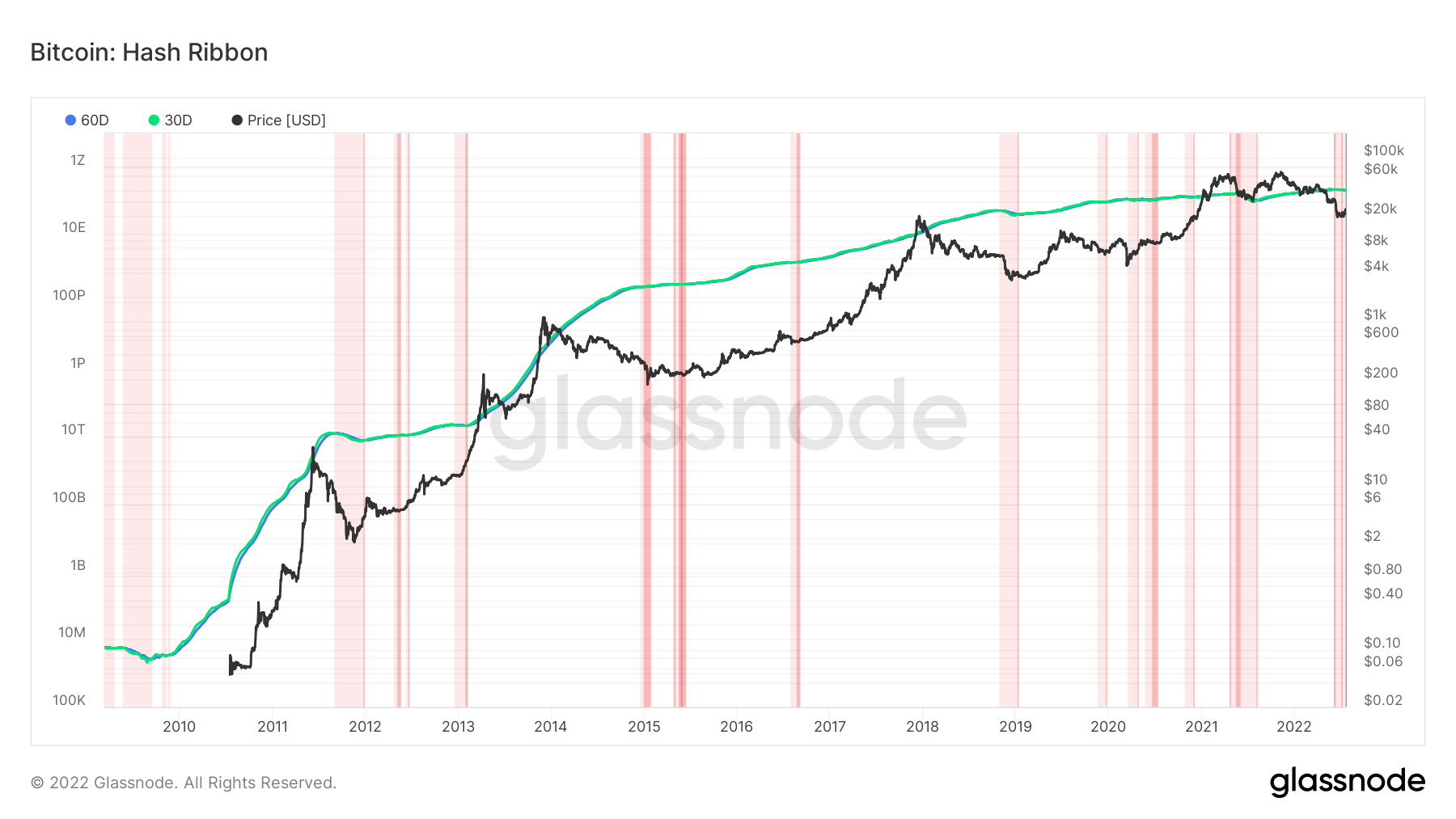 Данная ончейн-метрика (hash ribbon) помогает посредством подсчета хэшрейта определить наличие капитуляции майнеров. Майнеры традиционно капитулируют, когда издержки, связанные с майнингом, превышают вознаграждение за добытые блоки.
