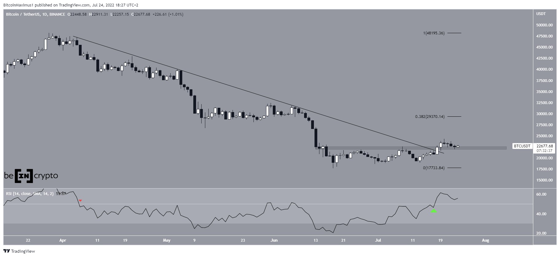 Во-вторых, рынок также взял барьер в виде горизонтальной области $22 300 и превратил ее в поддержку. Таким образом, цена прорвала как диагональный, так и горизонтальный уровни сопротивления.
