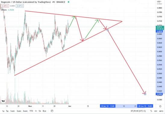 Однако стоит отметить, что на криптовалютном рынке сокращающиеся треугольники довольно часто пробивают вверх. В связи с этим гипотеза о снижении стоимости Dogecoin может оказаться неверной.