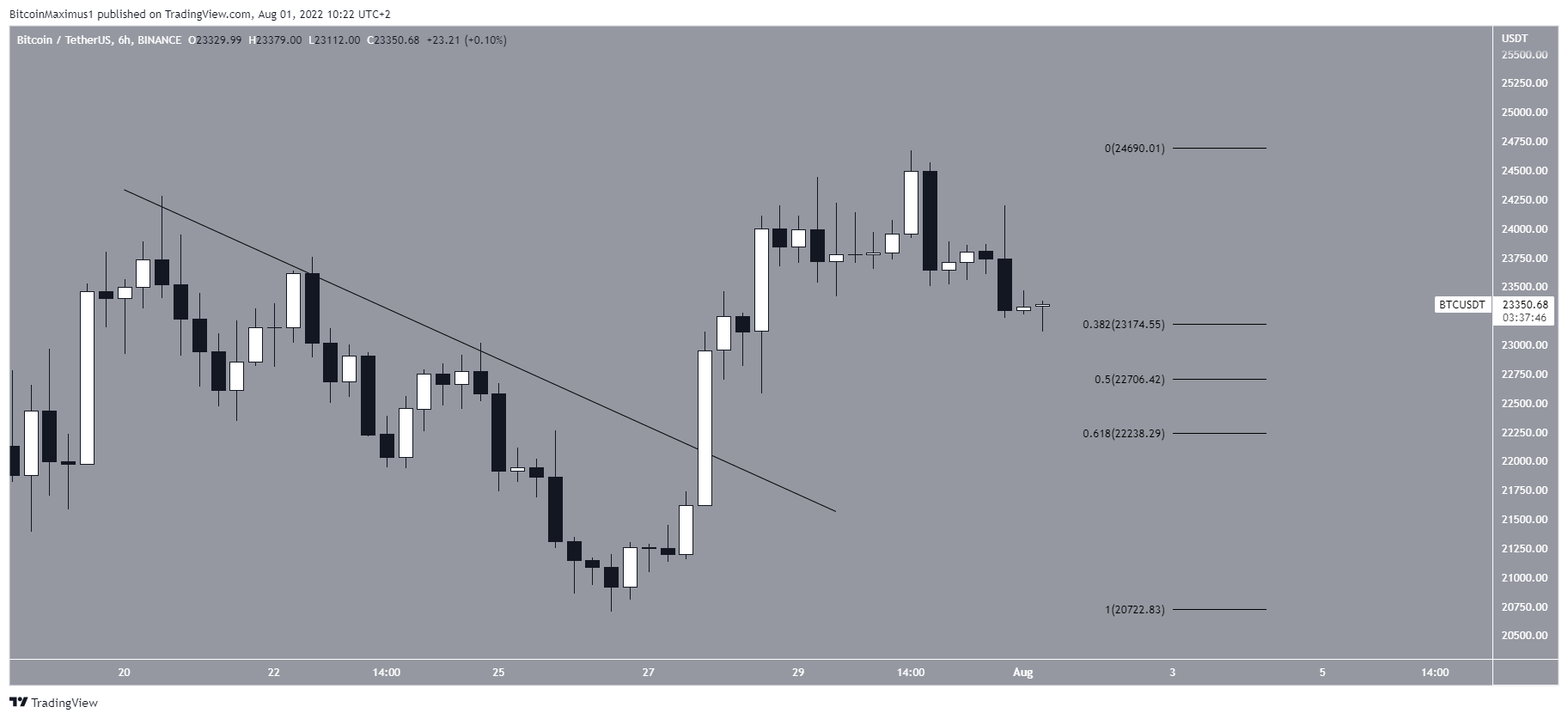 Сейчас BTC пытается нащупать поддержку над уровнем Фибо 0.382 коррекции на $23 175. Пока неясно, сможет ли эта область обусловить разворот рынка, или же биткоин снизится в направлении уровней Фибо 0.5 и 0.618 коррекции на $22 700 и $22 240, соответственно.