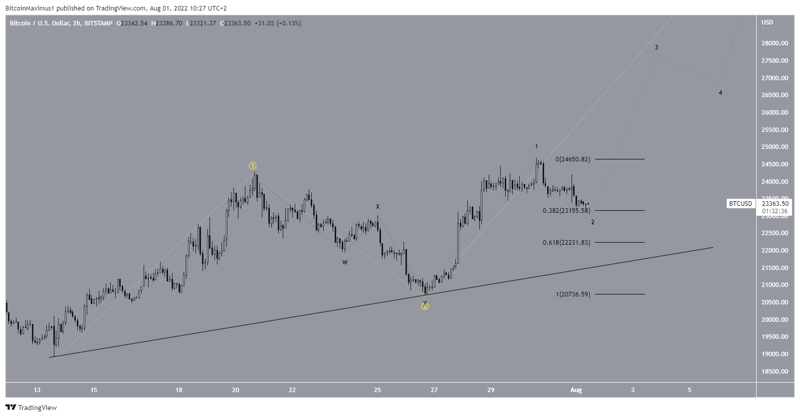 Поскольку данная волновая структура выглядит как формация 1-2/1-2, просадка цены ниже линии восходящей поддержки и уровня Фибо 0.618 на $22 230 отменит этот сценарий.