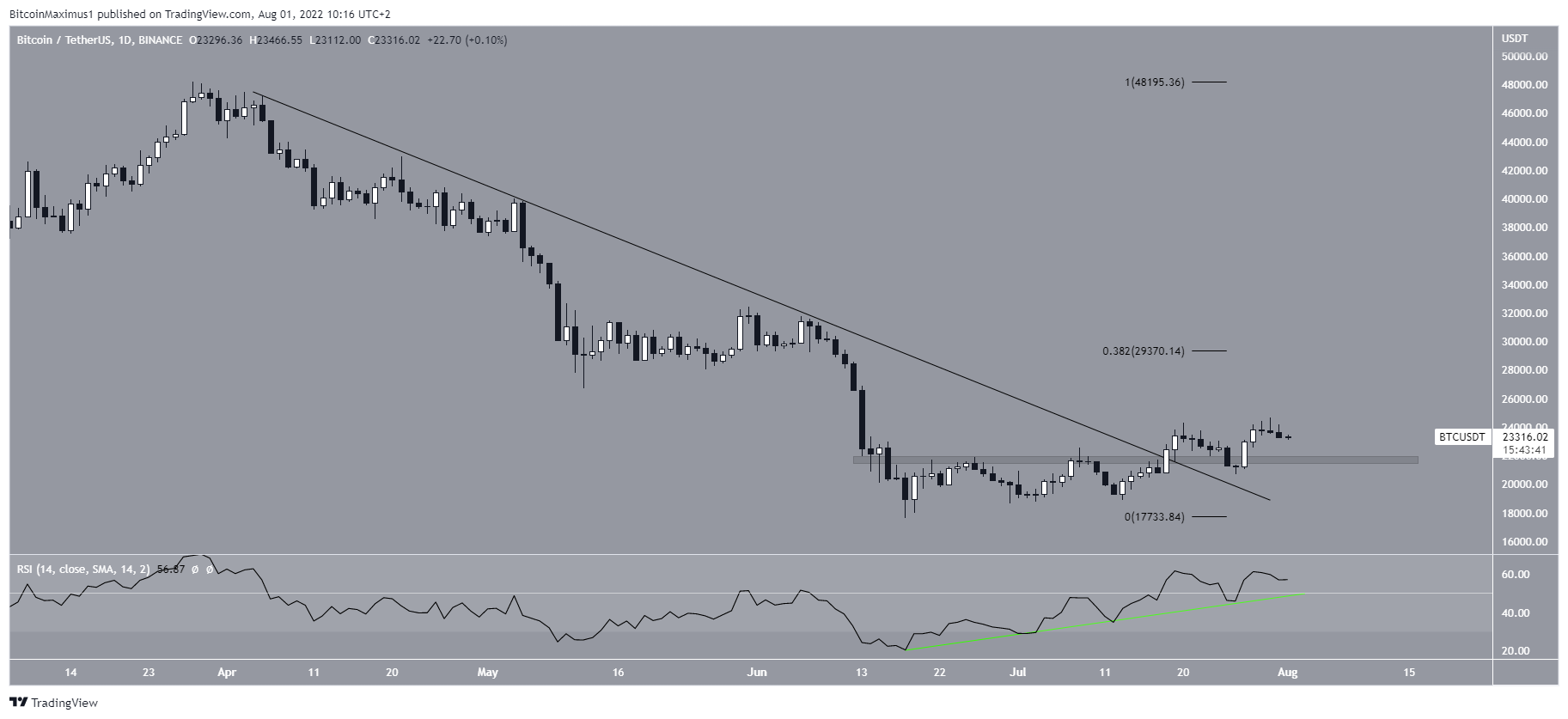 Кроме того, цена прорвалась выше горизонтальной области $21 750 и превратила ее в поддержку.