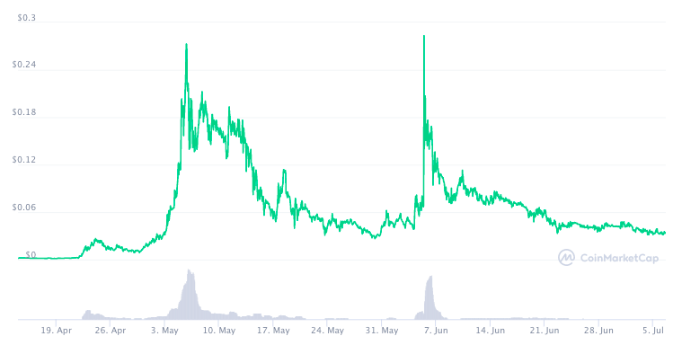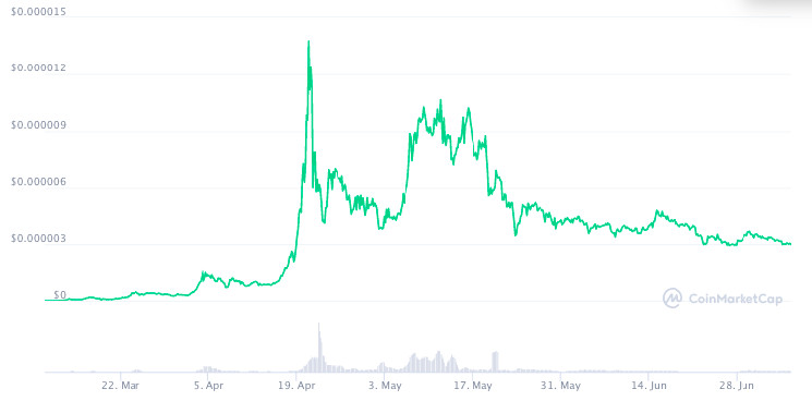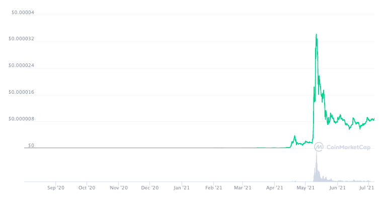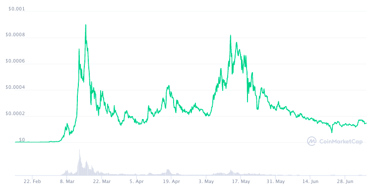 15 марта токен достиг своего пика в $0.0008981, а 15 мая почти повторил результат, добравшись до цены в $0.0008183. Максимальная капитализация проекта в мае составила $336 млн.