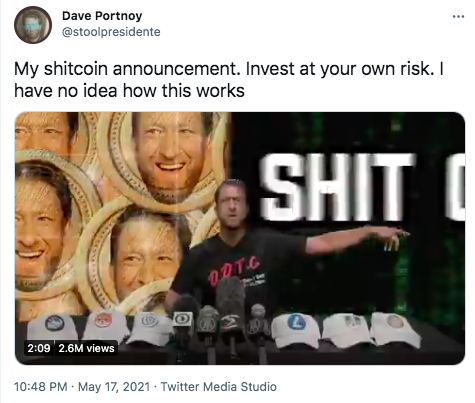 «Мое объявление о шиткоине. Инвестируйте на свой страх и риск. Я понятия не имею, как это работает», — написал в мае в своем Twitter инвестор и основатель сайта Barstool Sports Дэйв Портной. Его аудитория в соцсети — 2.5 млн человек.