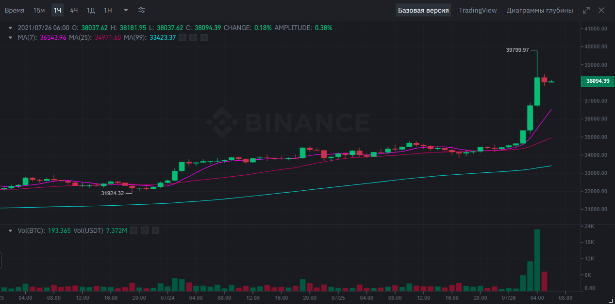 Курс первой криптовалюты на новость от Amazon ответил положительным изменением. С торговли в узком ценовом диапазоне 33 800-34 500$ на протяжении последних суток, Биткоин резко подскочил до отметки в 39 799$ на Binance. В одной пятнадцатиминутной стреле были приобретены целый 3 000 долларов в плюс: с 36 800$ до почти 40 000$.