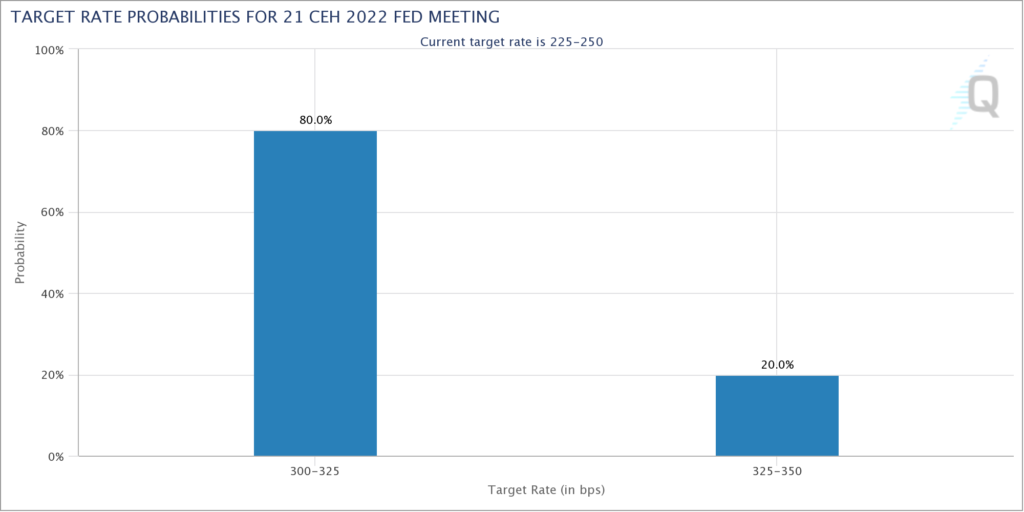 Главное событие недели, которое оказывает давление на первую криптовалюту, — заседание ФРС 21 сентября. Согласно рынку фьючерсов, вероятность повышения ключевой ставки сразу на 75 б. п. составляет 80%.
