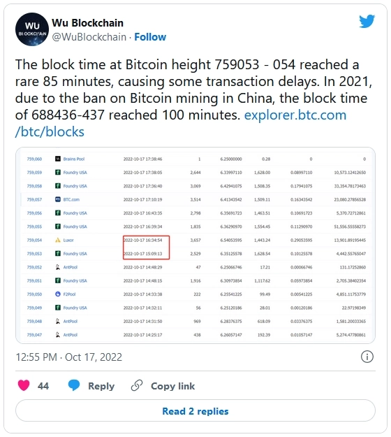 Что произошло? 17 октября нахождение биткоин-блока 759 054 заняло у майнеров 85 минут, тогда как среднее время, предусмотренное алгоритмом блокчейна, составляет лишь 10 минут. Как сообщил аналитик Колин Ву в своем Twitter со ссылкой на данные BTC.com, в конечном итоге блок добыл майнинговый пул Luxor. Он также отметил, что эта ситуация вызвала задержку транзакций в сети.