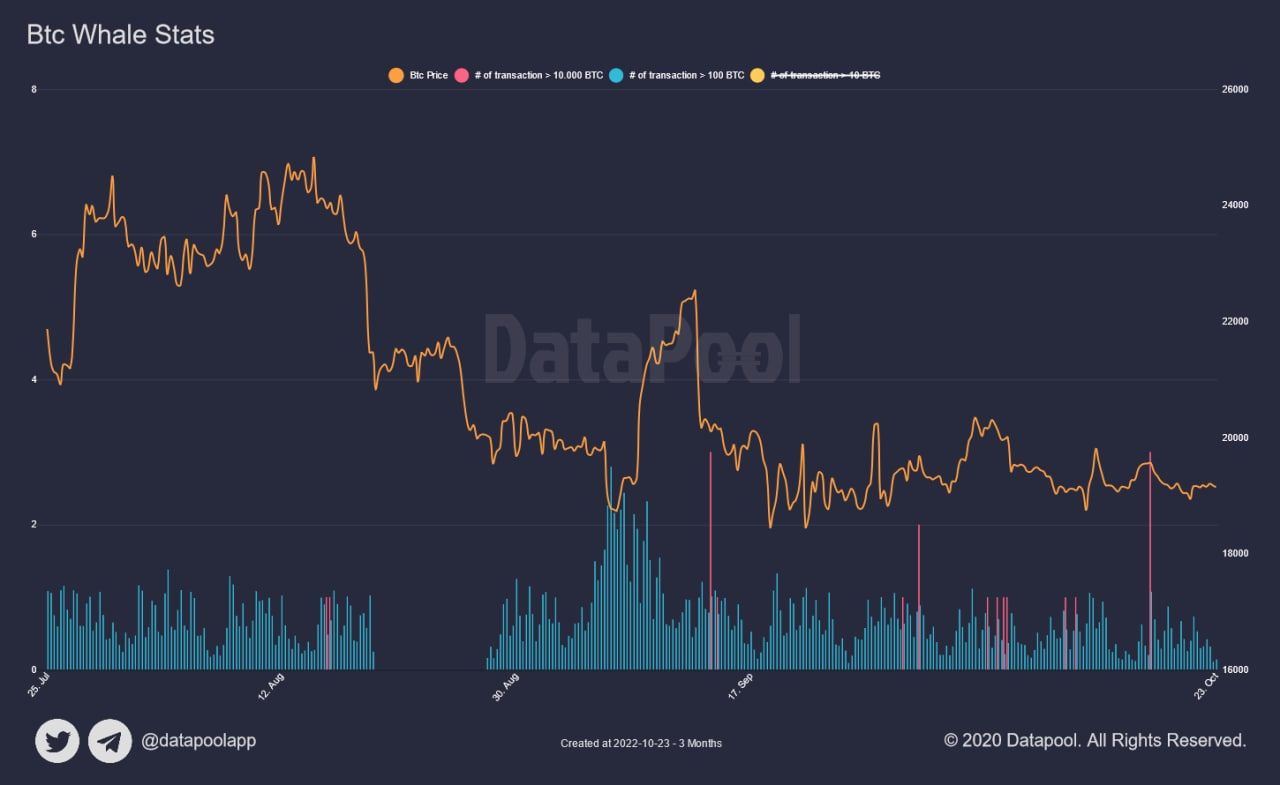 По данным DataPool, по состоянию на 23 октября количество транзакций биткоин-китов от 100 BTC составляло 106, что примерно на 86% меньше, чем 813 транзакций, зарегистрированных 25 июля.