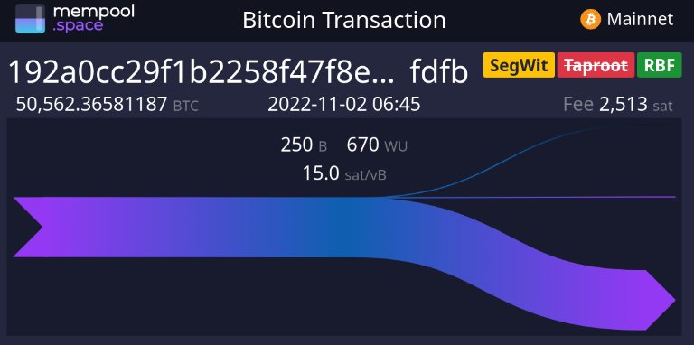 Недавно состоятельный пользователь отправил более 50 562 BTC стоимостью $ 1 млрд на другой адрес, заплатив комиссию всего в 2 513 сатоши, что эквивалентно половине доллара. Это беспрецедентная стоимость для перемещения такой огромной суммы.