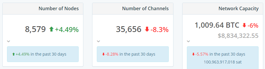 По данным 1ML, в LN-сети в настоящее время работает 8579 нод, связывающих между собой более 35 тысяч платежных каналов. Общая емкость сети превышает 1000 BTC.