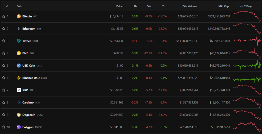 За последние сутки ведущие криптовалюты подешевели на 9,5% и 9,7% соответственно. На момент написания цифровое золото торгуется вблизи $16 750, эфир — $1184.