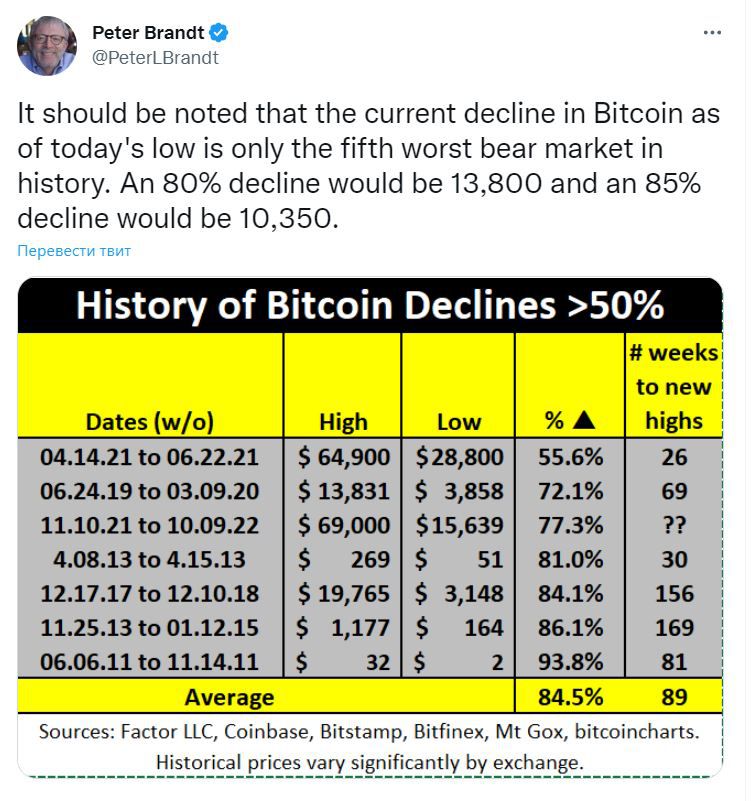 «Нужно отметить, что текущее снижение биткоина делает этот медвежий рынок только пятым по уровню падения в истории [криптовалюты]. В случае, если BTC упадет на 80%, мы увидим биткоин по $13 800, а при снижении на 85% – по $10 350», — написал он в своем микроблоге.