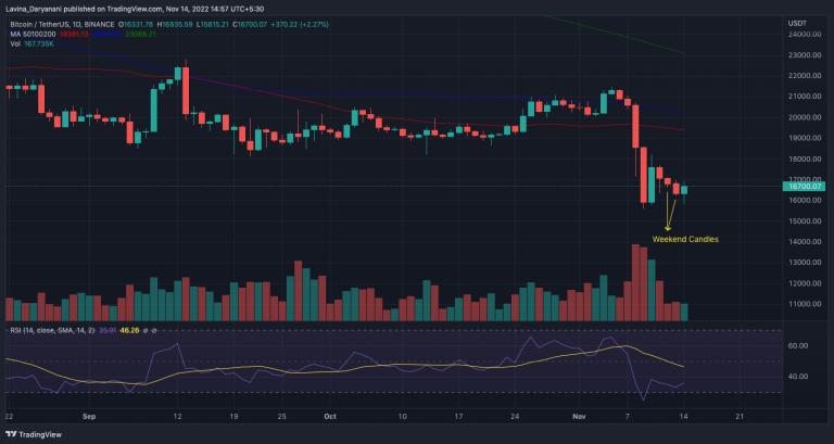 Несмотря на то, что свечи, зарегистрированные в выходные дни — как в субботу, так и в воскресенье — были красными, большого отклонения вниз отмечено не было. В целом за указанный период BTC колебался в диапазоне от 16 до 17 тысяч долларов.